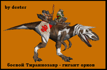 Название:боевой Тираннозавр-гигант орков Автор:dester (основа от olofmoleman) Описание: Сама модель взята за основу из игры ParaWorld(там этот юнит был как Животное-титан у пустынников) Импорт.текстуры: TirexGIANT.blp