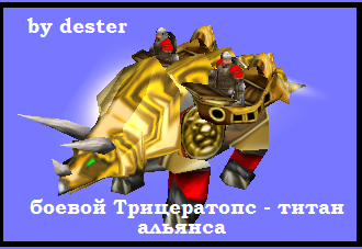 Название:боевой Трицератопс-титан альянса Автор:dester Описание: Сама модель взята за основу из игры ParaWorld(там этот юнит был как Животное-титан у Северян) Импорт.текстуры: T_glue.blp TriceratopsGIANT.blp TriceratopsHEAD.blp