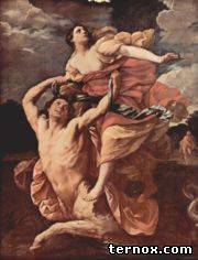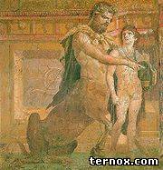 Слово «кентавр» (др.-греч. κένταυρος, kentauros), или латинизированный вариант — «центавр» (лат. centaurus), традиционно возводится к словообразованию, состоящему из двух греческих корней: kenteo - колоть и tauros - бык, которое может интерпретироваться и как убийца быков[2] или охотник на быков, и как погонщик быков или даже ковбой[3]. Образ кентавров предположительно возник как плод фантазии представителей цивилизованных, но не знавших ещё верховой езды народов, впервые столкнувшихся с конными всадниками неких северных кочевых племён: скифов[4], тюрок[5] или касситов[6]. Этим объясняется как свирепый нрав кентавров, так и их связь с быками — основой хозяйства кочевников было скотоводство. Согласно другой версии[источник не указан 290 дней], греки, впервые попавшие на территорию нынешнего Крымского полуострова, были настолько шокированы способностью тавров ездить верхом на коне, не прибегая к помощи повозки или колесницы, что они приняли их не за людей, а мифических существ. Согласно рационалистическому истолкованию античного времени, это были юноши из деревни Туча, которые изобрели верховую езду и перебили диких быков [7]; либо люди из города Пелефроний, где был найден способ приручать лошадей [8]. [править] Мифы Кентавры считались потомками Иксиона и Нефелы — или прямыми, или через общего для племени предка Кентавра, ожеребятившего магнесийских кобылиц. Некоторые рассказывают, что кентавры были воспитаны на Пелионе нимфами и, возмужав, вступили в связь с кобылицами, от чего и родились двуприродные кентавры [9]. Некоторых кентавров выводили из этого генеалогического ряда, вероятно, чтобы облагородить их. Так, Хирон считался сыном Зевса и кобылицы Филиры, Фол — сыном Силена. Иногда кентавров считают потомством Посейдона, что находит объяснение в мифологическом прошлом этого божества, тотемически связанного лошадьми и имевшего коня атрибутивным животным. Обычно кентавры показываются дикими и несдержанными существами, в которых преобладает животная природа, но известны и мудрые кентавры, в первую очередь, Фол и Хирон, друзья и учителя Геракла и некоторых других героев. Популярным поэтическим сюжетом античности была кентавромахия, битва лапифов с кентаврами, разгоревшаяся из-за необузданного нрава последних на свадебном пиру царя лапифов Пирифоя. Гвидо Рени. Похищение ДеянирыЖили кентавры в горах Фессалии вплоть до того дня, когда Геракл рассеял их по всей Элладе. Большая их часть была перебита Гераклом [10] (см. Фол (кентавр)). Те, кто спаслись от Геракла, заслушались сирен, перестали есть и умерли от голода [11]. По одному рассказу, Посейдон скрыл их в горе в Элевсине. Один из кентавров, Несс, сыграл роковую роль в гибели Геракла. Он попытался похитить жену Геракла Деяниру, но был сражён стрелой с ядом Лернейской гидры. Умирая, Несс решил отомстить Гераклу, посоветовав Деянире собрать его кровь, так как она якобы поможет ей сохранить любовь Геракла. Деянира пропитала ядовитой кровью Несса одежду Геракла, и он умер в страшных